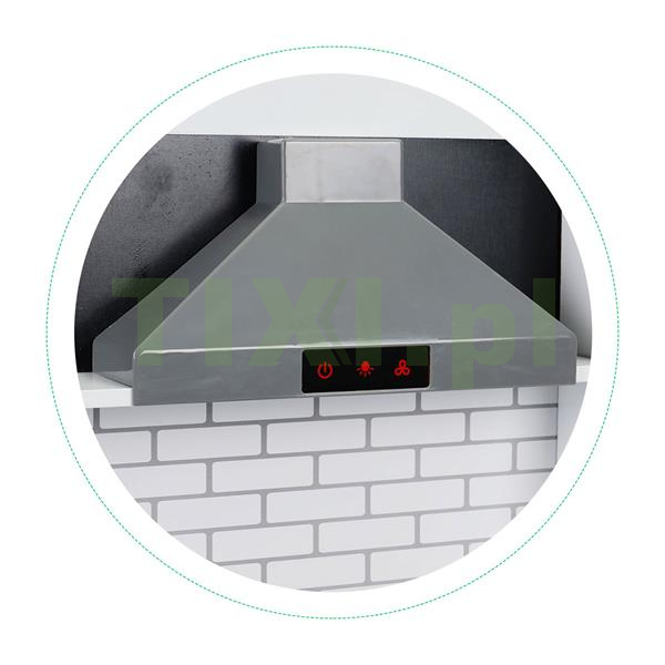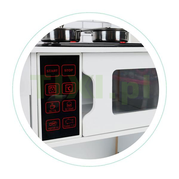 Do dyspozycji szefa kuchni są m.in. podświetlane palniki, które dodatkowo wydają dźwięk gotowanej wody. Pod blatem znajduje się piekarnik, mikrofala i duża szafka. W górnej części zamontowany jest wentylator oraz haczyki na przybory.