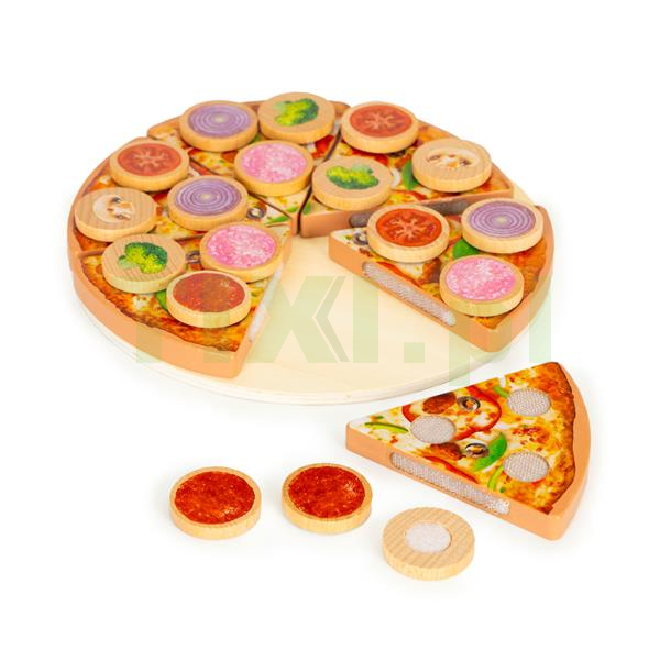 W komplecie z pizzą znajduje się również karton, idealny do jej zapakowania, wszystko jak w prawdziwej pizzerii. Dodatki do ciasta to szynka, salami, pieczarki, brokuły, pomidory i cebula - wszystkie w postaci 3 drewnianych krążków z rzepami. Dzięki wielu elementom zabawa nie będzie miała końca, a jeśli Twoja pociecha posiada swoją zabawkową kuchnię, to ta pizza będzie idealnym dodatkiem, który w ciekawy sposób urozmaici zabawę.