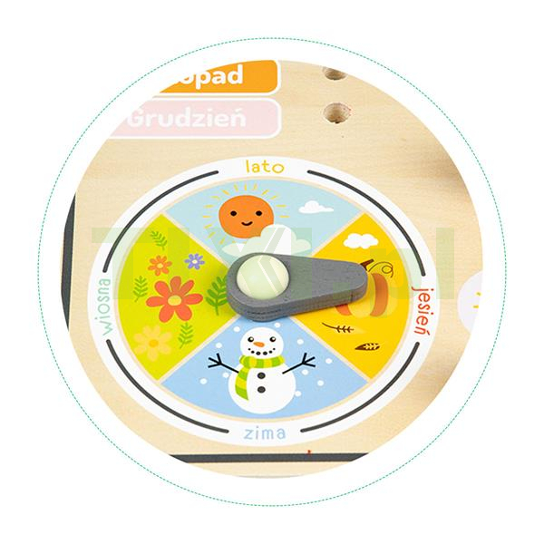 Tablica pozwoli maluchom na poznanie dni tygodnia, miesięcy, pór roku, oraz nauczy poprawnego odczytywania godziny. Poza nauką zabawka sprawi wile radości i rozwinie zdolności manualne dziecka.
