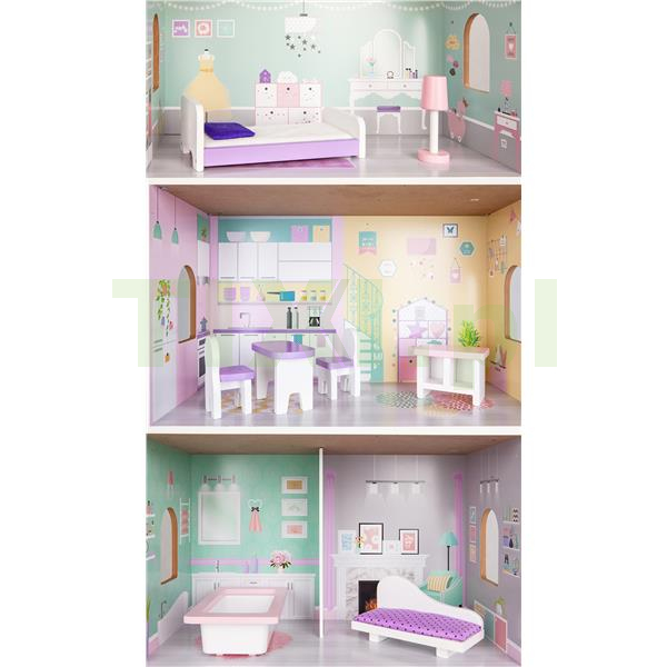 Domek jest wykonany z płyt z naniesioną kolorową grafiką. Każde z pomieszczeń posiada osobną kolorystykę i dedykowane do niego mebelki, które można dowolnie przestawiać. Na bocznych ścianach domku znajdują się po 2 okna na każdym z pięter. Otwarte, przestronne pomieszczenia umożliwiają swobodną zabawę laleczkami.