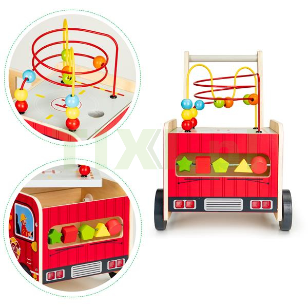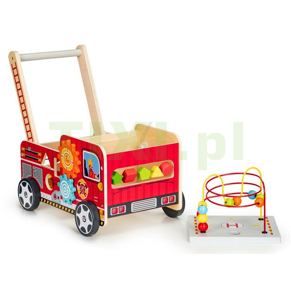 W górnej części pchacza znajduje się przeplatanka z kolorowymi koralikami, zabawa polega na ich przesuwaniu z jednego końca na drugi.