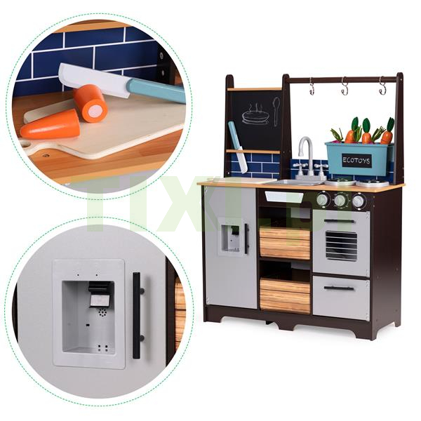 W zestawie z kuchnią znajduje się drewniany nóż, deska oraz warzywa, które można pokroić na kawałki. Poszczególne części łączone są na rzep, dzięki temu podczas krojenia ma się wrażenie jakby kroiło się prawdziwe warzywo.