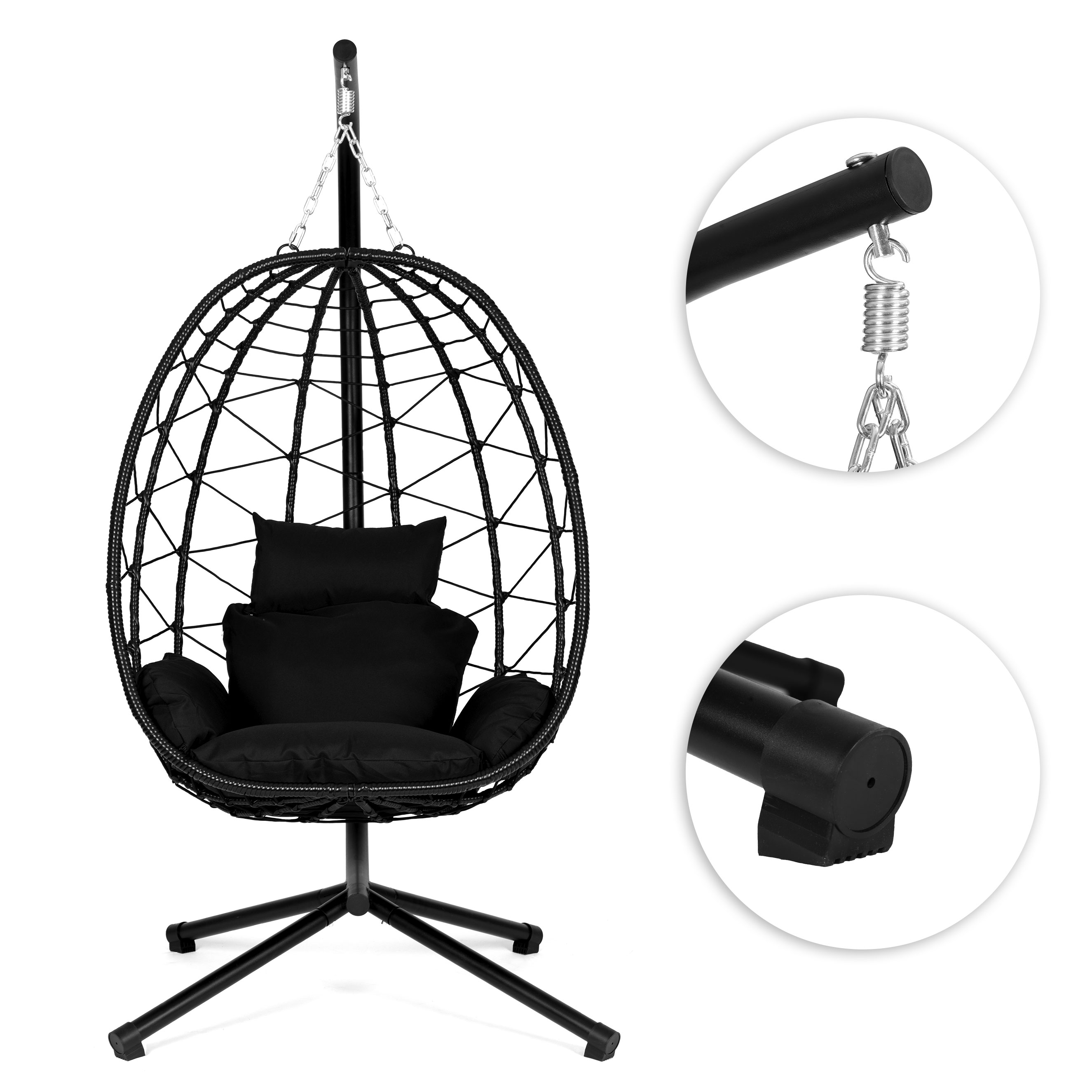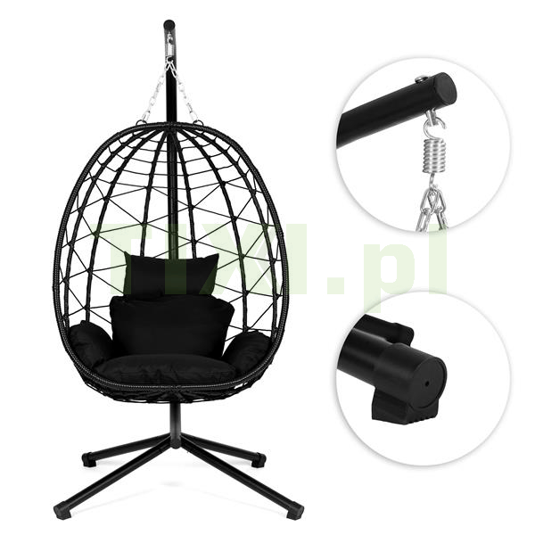 W zestawie z fotelem znajdują się miękkie poduszki, które zapewniają optymalne podparcie i komfort siedzenia. Ich kształt został dopasowany do formy kokonu, a rozpinane poszewki umożliwiają regularne ich pranie - dzięki czemu są łatwe w utrzymaniu czystości. Dodatkowo zagłówek ma możliwość przymocowania do konstrukcji, tym samym zapobiegając przesuwaniu się i zapewniając pełną stabilność podczas użytkowania.