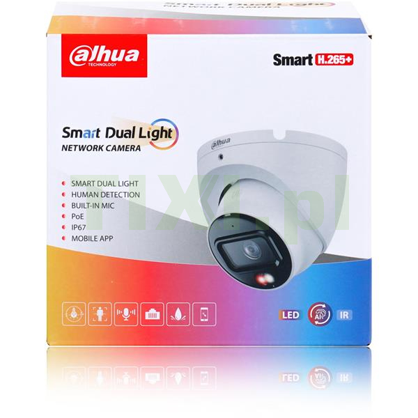 | Odległość oświetlenia | Do 30 m (98,43 ft) (IR) Do 30 m (98,43 ft) (ciepłe światło) |