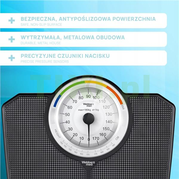 Model Webber BMI jest wykonany z solidnych materiałów, co zapewnia długowieczność i odporność na intensywne użytkowanie. Jego klasyczny wzór i czarna kolorystyka pasują do każdej łazienki — od stylu retro po nowoczesne wnętrza. Analogowy mechanizm jest odporny na warunki wilgotne i drgania, dzięki czemu waga pozostaje dokładna przez lata. Wybierając tę wagę, zyskujesz urządzenie, które łączy klasyczny charakter i praktyczność w codziennej trosce o zdrowie.