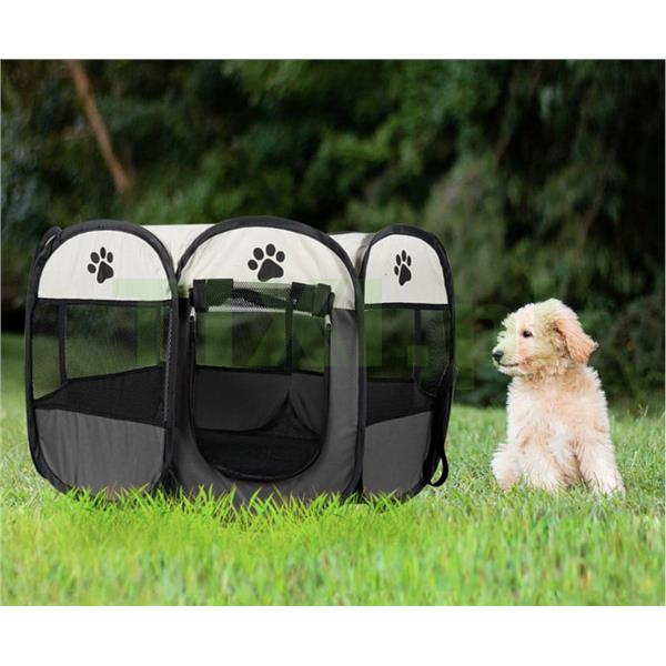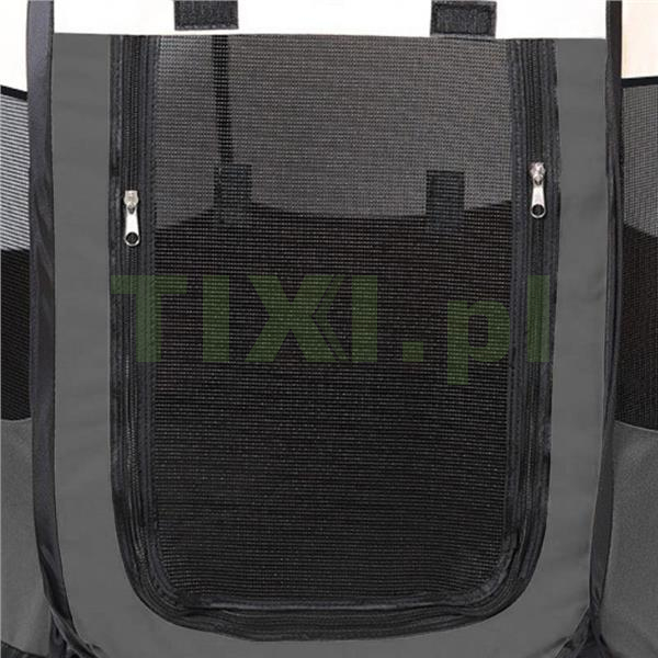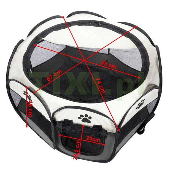 Składany, tekstylny kojec wykonany na planie ośmiokąta przeznaczony dla psów, szczeniąt, kotów oraz niewielkich zwierząt. Kojec jest idealnym rozwiązaniem dla właścicieli zwierząt, szczególnie gdy zajdzie potrzeba wydzielenia swoim pupilom bezpiecznej przestrzeni. Produkt nadaje się do użycia zarówno w domu, jak i w plenerze.