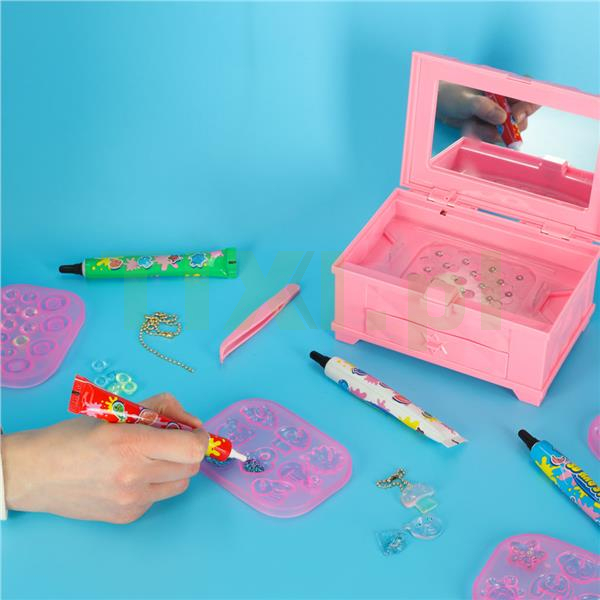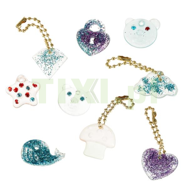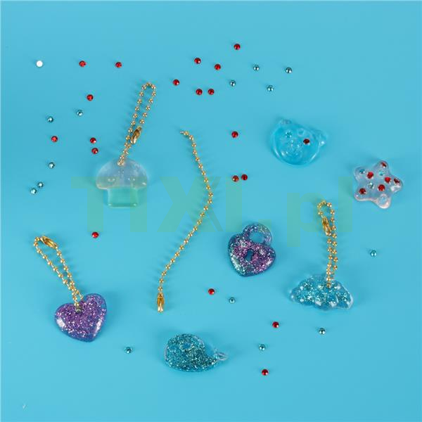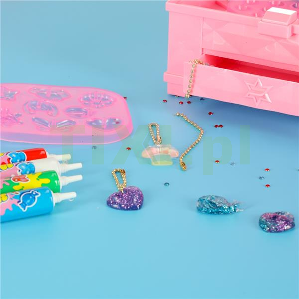 Zestaw zawiera cztery tubki kleju w kolorach: czerwonym, zielonym, niebieskim i białym, a także cztery foremki z różnorodnymi kształtami. Dodatkowe elementy dekoracyjne, takie jak brokat i małe kryształki, pozwalają na dowolne ozdabianie biżuterii. Akcesoria takie jak pilnik i pęseta ułatwiają pracę.