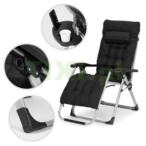 W zestawie z leżakiem znajduje się zagłówek oraz duża, miękka pikowana poduszka, która pokrywa zarówno siedzisko, jak i oparcie, zapewniając wysoki komfort podczas odpoczynku. Dzięki niej leżak staje się jeszcze wygodniejszy, pozwalając w pełni się odprężyć i cieszyć chwilą relaksu. Poduszka została wykonana z materiału odpornego na warunki atmosferyczne. Posiada również wytrzymałe taśmy do przymocowania do ramy leżaka oraz specjalną zakładkę umożliwiającą nasunięcie jej na górną część oparcia, co zapobiega przesuwaniu się podczas użytkowania.