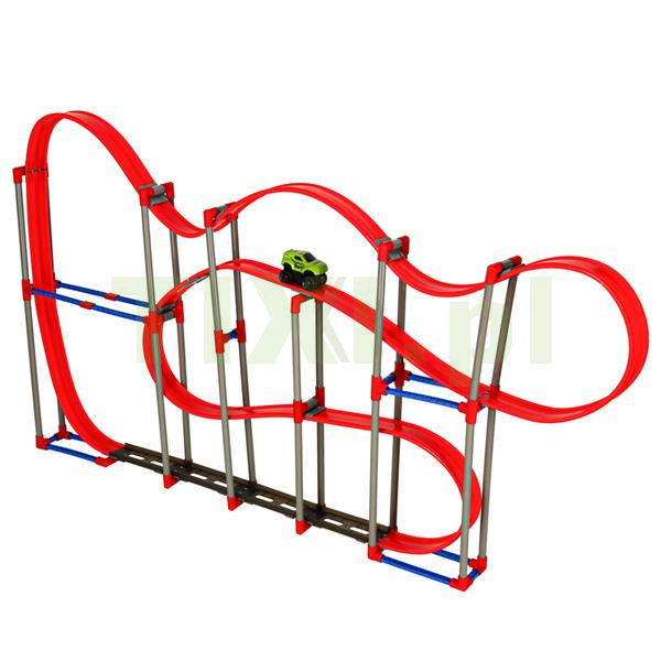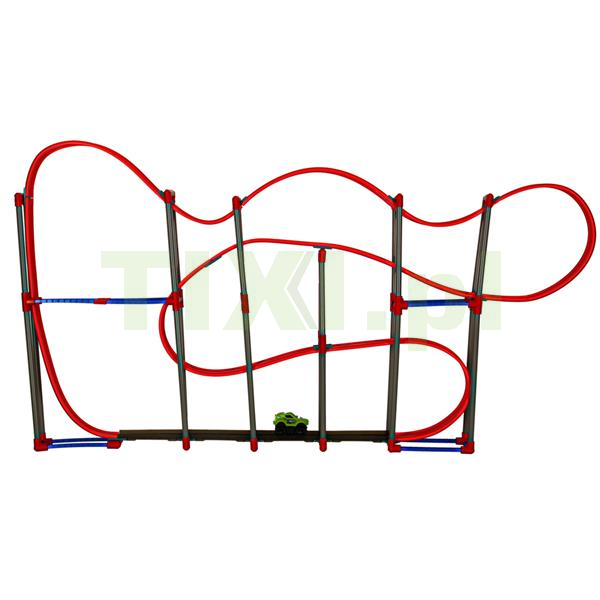 Zestaw zawiera 120 elementów, które pozwalają zbudować imponującą trasę o wymiarach 123 x 36 cm, na której auto może jeździć, pokonując ostre zakręty, strome podjazdy, a nawet odwrócone odcinki trasy.