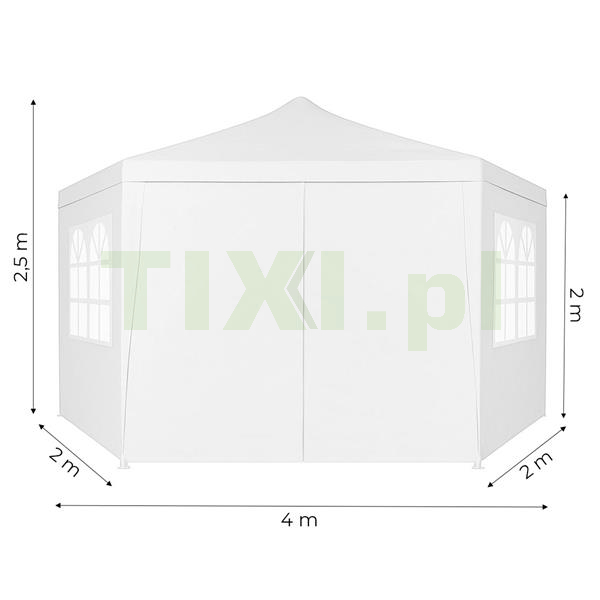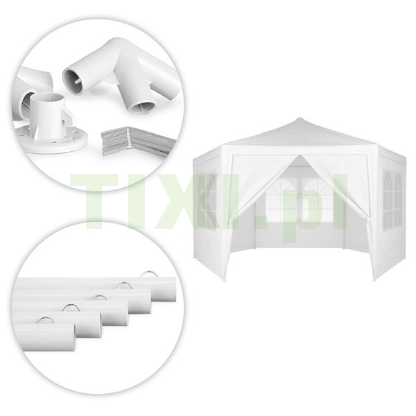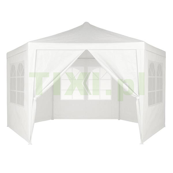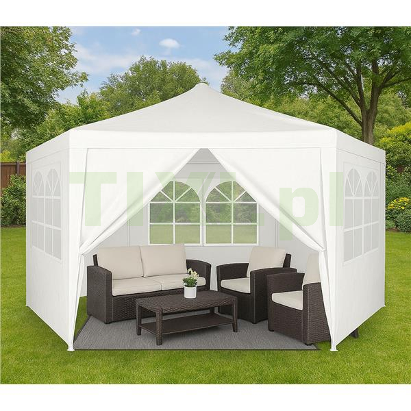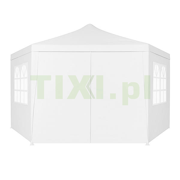 Ściany pawilonu wyposażone są w duże okna, które zapewniają dostęp naturalnego światła do wnętrza, jednocześnie chroniąc przed wiatrem i opadami. Dzięki nim wnętrze pawilonu jest jaśniejsze oraz bardziej przyjazne, co zwiększa komfort użytkowania podczas spotkań, przyjęć czy wydarzeń plenerowych. Namiot posiada wejście zapinane na zamek błyskawiczny, zapewniające szybki i wygodny dostęp do wnętrza namiotu. To praktyczne rozwiązanie, które ułatwia korzystanie z pawilonu, zwłaszcza gdy często przemieszczasz się między jego wnętrzem, a otoczeniem.