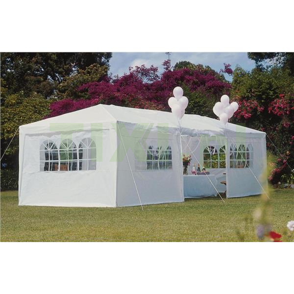 Szkielet namiotu wykonany jest z grubych, metalowych rurek malowanych proszkowo, o średnicy 32/25/25 mm, co zapewnia stabilność i odporność na korozję. Solidna konstrukcja gwarantuje trwałość, nawet przy intensywnym użytkowaniu. Każda z nóg namiotu jest mocowana do podłoża za pomocą śledzi, co zwiększa jego stabilność. Zadaszenie i ściany wykonano z wytrzymałego oraz odpornego na warunki atmosferyczne polietylenu o gramaturze 100 g/m2 w eleganckim, białym kolorze.