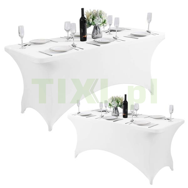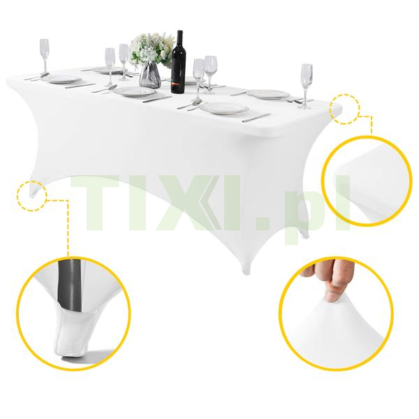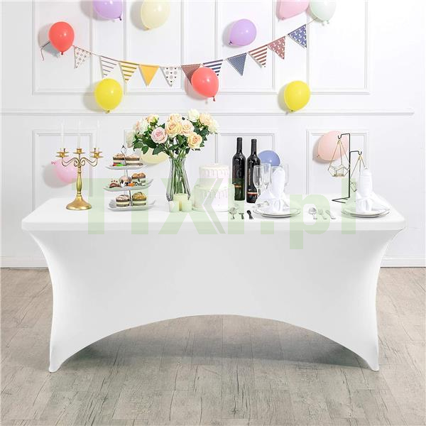 Pokrowiec sprawi, że nawet mało reprezentacyjny stół stanie się niezwykle gustownym elementem dekoracyjnym na uroczystości. Stosując ten elastyczny obrus możesz pięknie zaprezentować słodki kącik na weselu, rękodzieło na wystawie czy catering podczas biznesowego spotkania. Elastyczny materiał sprawia, że łatwo założysz go i zamocujesz na nogach stołu, dzięki czemu obejmie on cały mebel, napinając się i nadając mu elegancji.