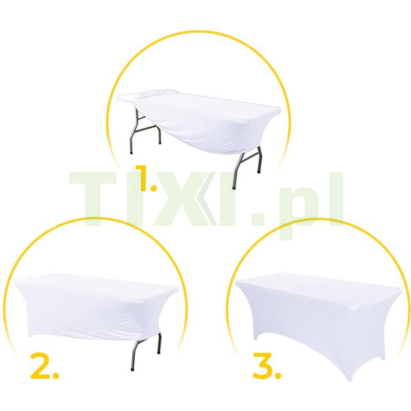 Aby założyć go na stół nie potrzebujesz dodatkowej osoby do pomocy, samodzielnie w 3 prostych krokach idealnie naciągniesz go na konstrukcję stolika. Zacznij od nałożenia materiału na blat, a następnie naciągnij narożniki i zamocuj do nóg, całość zajmie Ci kilka minut.