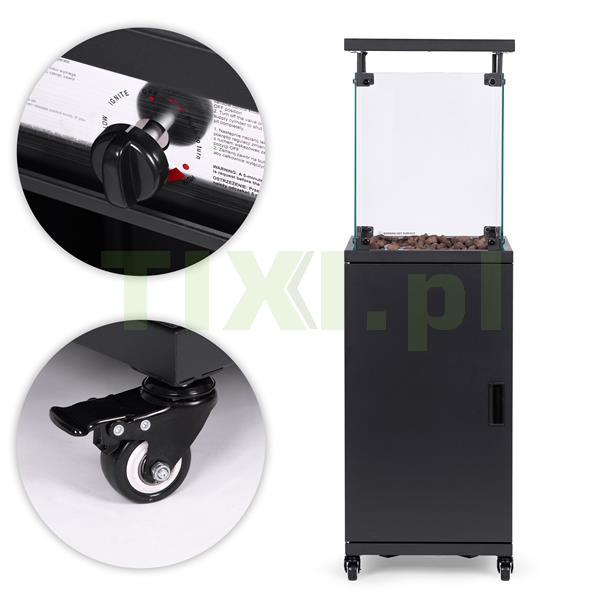 Ogrzewacz posiada specjalną, zamykaną przestrzeń na butlę gazową, co zapewnia nie tylko estetyczny wygląd, ale także większe bezpieczeństwo. Drzwiczki zamykane są na magnes i umożliwiają swobodny dostęp do butli i panelu sterowania, takie rozwiązanie sprawia, że butla pozostaje niewidoczna, a ogrzewacz zachowuje elegancki design i wysoki poziom bezpieczeństwa. Dodatkowo butla jest zabezpieczona specjalnym pasem który stabilizuje ją podczas przestawiania i transportu,