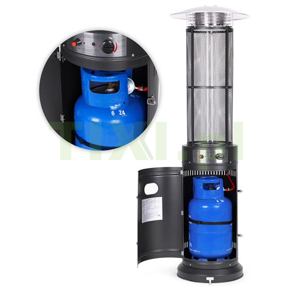 Ogrzewacz posiada specjalną, zamykaną przestrzeń na butlę gazową, co zapewnia nie tylko estetyczny wygląd, ale także większe bezpieczeństwo. Funkcjonalne drzwiczki umożliwiają wygodny dostęp do butli oraz sprawiają, że pozostaje niewidoczna, a ogrzewacz zachowuje elegancki design i wysoki poziom bezpieczeństwa. Dodatkowo butla jest zabezpieczona specjalnym pasem który stabilizuje ją podczas przestawiania i transportu,