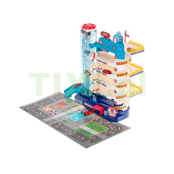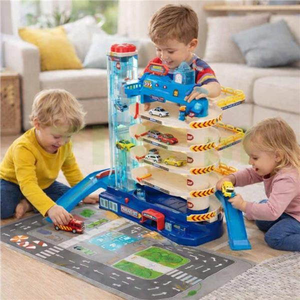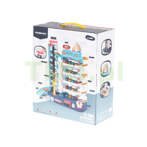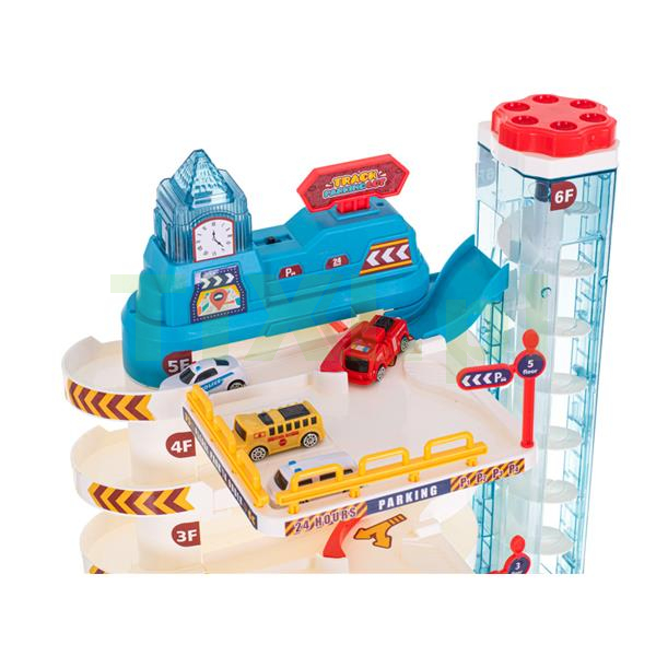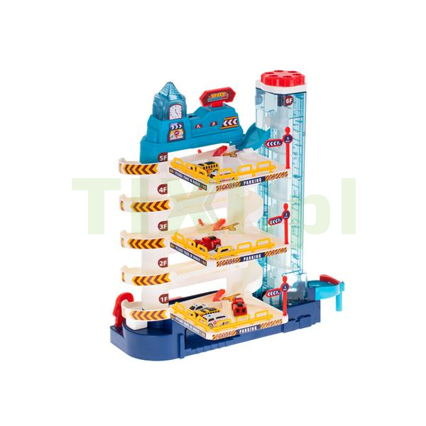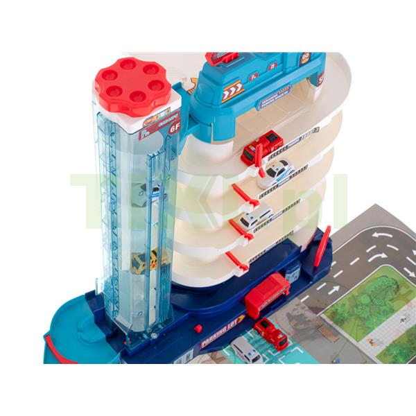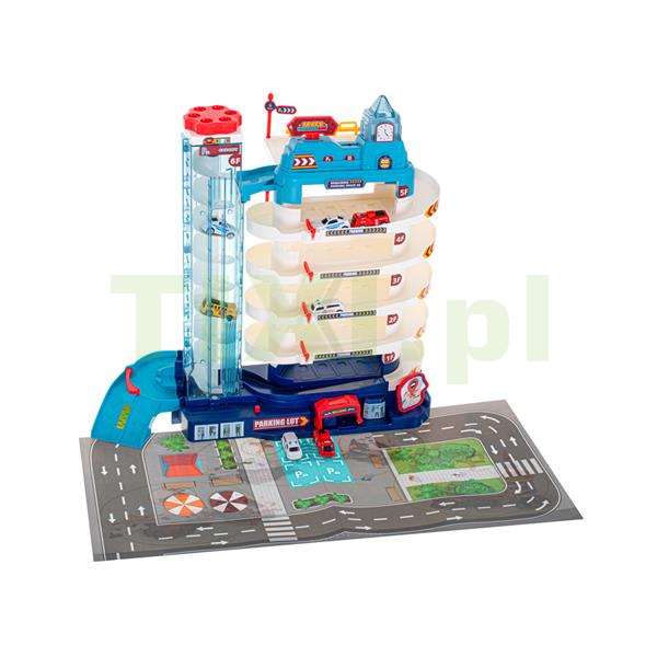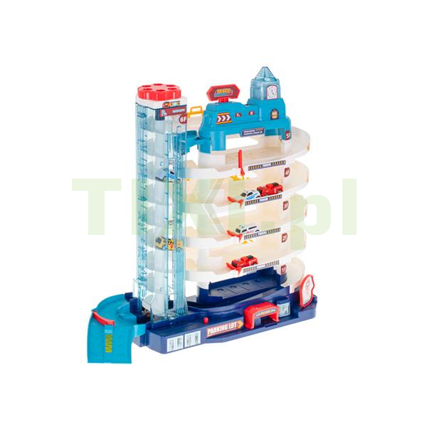 Parking ma aż 5 poziomów , przeznaczonych do parkowania samochodzików, które znajdziesz w zestawie. Na samą górę auta dostaną się za pomocą automatycznej windy.