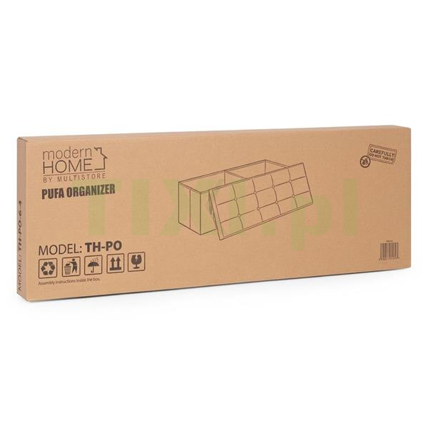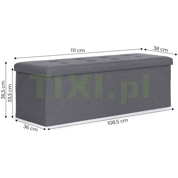 Wnętrze pufy zaprojektowano z myślą o wygodnym i uporządkowanym przechowywaniu różnych przedmiotów. Stabilna konstrukcja z płyt MDF tworzy pojemną przestrzeń na koce, zabawki, tekstylia oraz inne domowe drobiazgi, pomagając utrzymać porządek w pomieszczeniu.