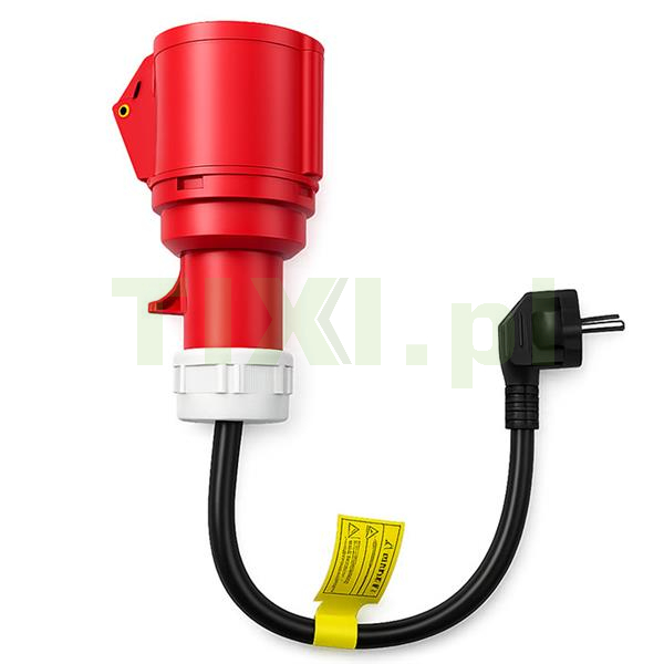Profesjonalna przejściówka siłowa umożliwiająca zasilanie urządzeń jednofazowych 230V z przemysłowego gniazda trójfazowego 32A. Adapter wykorzystuje jedną fazę z instalacji 3-fazowej i udostępnia napięcie 230V na wyjściu. To praktyczna redukcja 400V na 230V przeznaczona do zastosowań technicznych, warsztatowych oraz do mobilnych ładowarek EV 230V. Solidne złącza CEE oraz przewód 3x2,5 mm2 gwarantują stabilne parametry pracy przy maksymalnym obciążeniu 16A (3,5 kW).