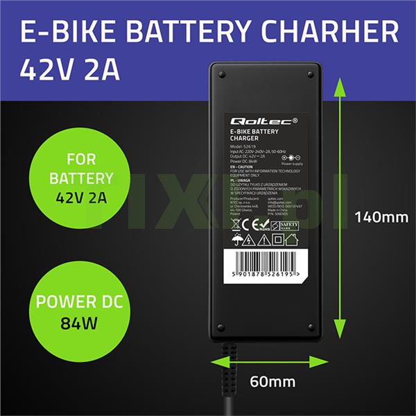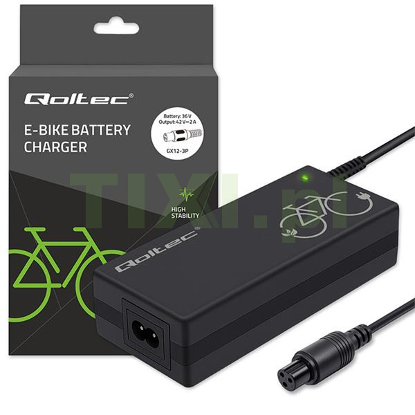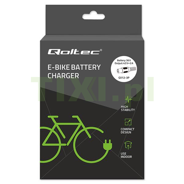 Ładowarka mobilna marki Qoltec o napięciu 42V i natężeniu ładowania 2A z wtykiem GX12-3Pin oraz ogólnej mocy ładowania 84W dedykowana do akumulatorów litowo-jonowych 36V, pozwala na naładowanie baterii z dowolnego gniazdka elektrycznego 230V. To wygodne i funkcjonalne rozwiązanie z zaawansowaną elektroniką, chroni twoją baterię podczas procesu ładowania.