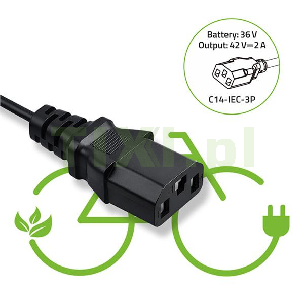 Uwagi: Przed zakupem należy sprawdzić gniazdo C14-IEC-3P (3-pin) Ładowarka kompatybilna z wieloma rowerami elektrycznymi między innymi : Prophete – modele City, Trekking i Urban z baterią 36 V Fischer e-Bike – serie ETH / ECU / ER Telefunken e-Bike – serie RC /