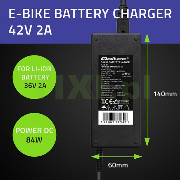 Ładowarka mobilna marki Qoltec o napięciu 42V i natężeniu ładowania 2A z wtykiem 5.5*2.1 oraz ogólnej mocy ładowania 84W dedykowana do akumulatorów litowo-jonowych 36V, pozwala na naładowanie baterii z dowolnego gniazdka elektrycznego 230V. To wygodne i funkcjonalne rozwiązanie z zaawansowaną elektroniką, chroni twoją baterię podczas procesu ładowania.