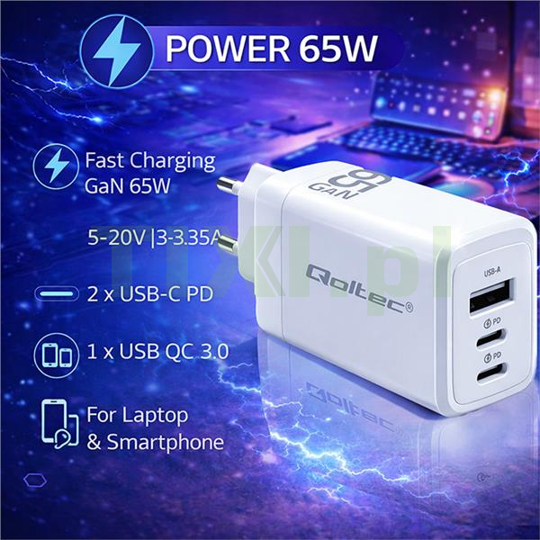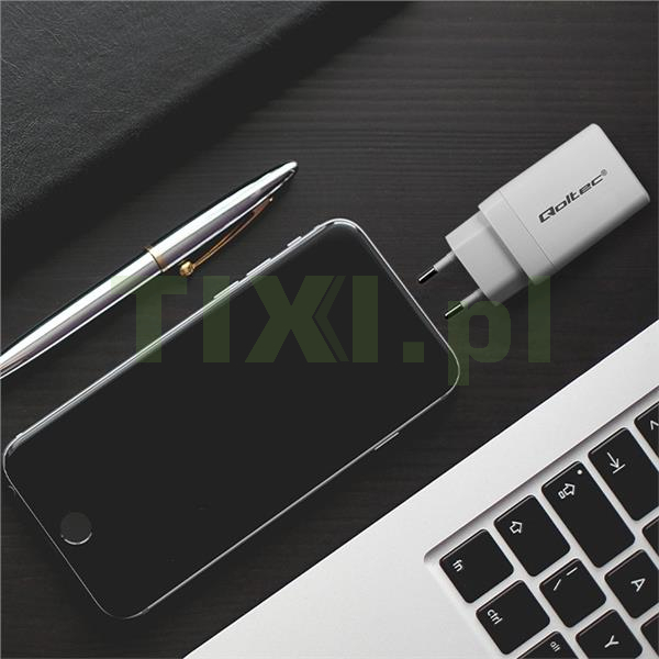 Ładowarka marki Qoltec została wyposażona w najnowocześniejszą technologię ładowania GaN polegającą na zastosowaniu nowego materiału półprzewodnikowego azotku galu. W zależności od rodzaju ładowanego urządzenia ładowarka dobiera odpowiednie napięcie i natężenie w zależności od parametrów baterii, chroniąc ją przed przegrzaniem.
