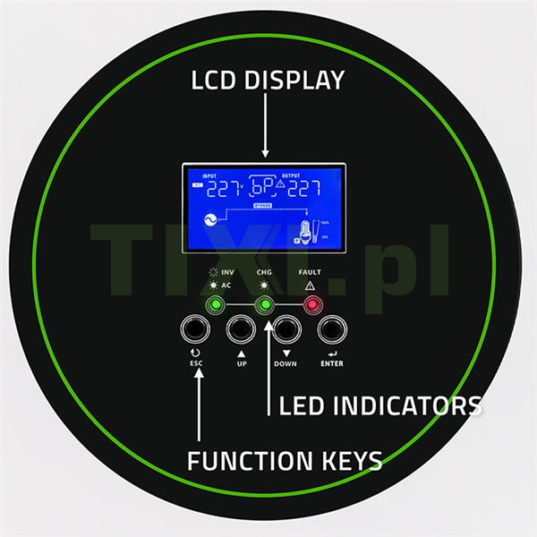 Produkt wyposażony w wielofunkcyjny, dotykowy łatwy w obsłudze wyświetlacz LCD z panelem sterowania. Ułatwia monitorowanie całej instalacji fotowoltaicznej . Pozwala skonfigurować zakres napięcia wejściowego dla urządzeń domowych i komputerów osobistych lub zmienić ustawienia priorytetu ładowarki AC/Solar. Dodatkowo wyświetlacz zapisuje dane i informuje o awariach, odpowiednio reagując, jeśli któryś z parametrów przekracza normę. W przypadku wystąpienia usterki falownik się wyłącza.