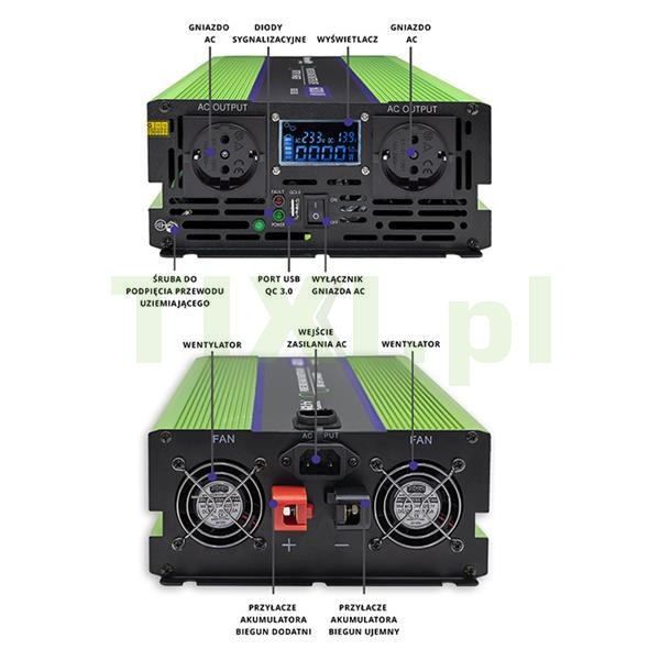 - Przetwornicy napięcia 12 V na 230 V, po podłączeniu akumulatora przetwornica pobiera potrzebną energię do zasilenia podłączonego urządzenia,