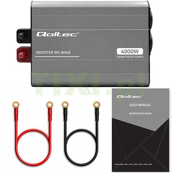Zawartość zestawu: 1 x Przetwornica napięć 2 x Przewód przyłączeniowy akumulatora 1 x Karta gwarancyjna 1 x Instrukcja obsługi