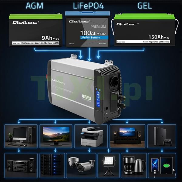 - funkcję bypass (UPS) czyli automatyczne przełączanie źródła zasilania między siecią 230V a akumulatorem 12V – bez konieczności ingerencji użytkownika