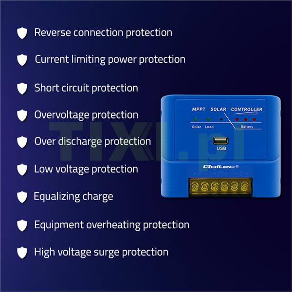 • Zabezpieczenie przed nadmiernym rozładowaniem akumulatora : odłącza obciążenie, gdy napięcie spadnie poniżej bezpiecznego poziomu