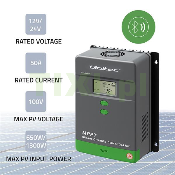 Produkt wyposażony jest w zaawansowany wyświetlacz LCD i Bluetooth, który zapewnia użytkownikom pełną kontrolę i przejrzystość działania systemu. Intuicyjne menu wyświetlacza ułatwia konfigurację i dostosowanie ustawień do indywidualnych potrzeb użytkownika. Wyświetlacz pokazuje bieżące parametry pracy, co umożliwia bieżące śledzenie wydajności systemu. Dzięki zewnętrznemu czujnikowi temperatury i komunikacji Bluetooth, możesz zdalnie monitorować stan systemu przez aplikację mobilną, jednocześnie chroniąc akumulator przed przeładowaniem lub przegrzaniem. Użytkownicy mogą szybko sprawdzić aktualny stan pracy oraz informacje o ewentualnych błędach lub alarmach.
