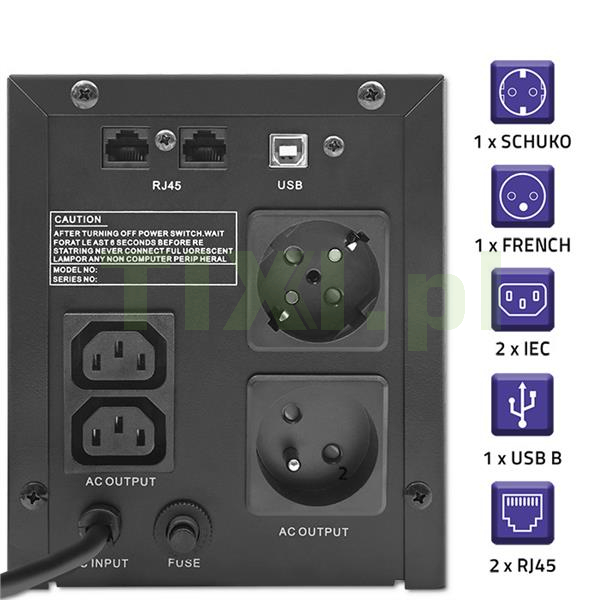 Gniazda wyjściowe: 1 x FRENCH (Typ E CEE 7/5) 1 x SCHUKO (Typ F CEE 7/3) 2 x IEC (IEC 320 C13) 2 x RJ45 1 x USB typ B (port do diagnostyki urządzenia)
