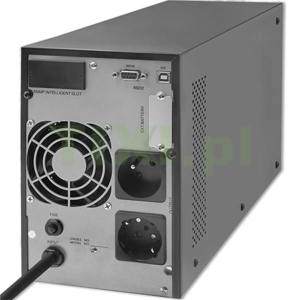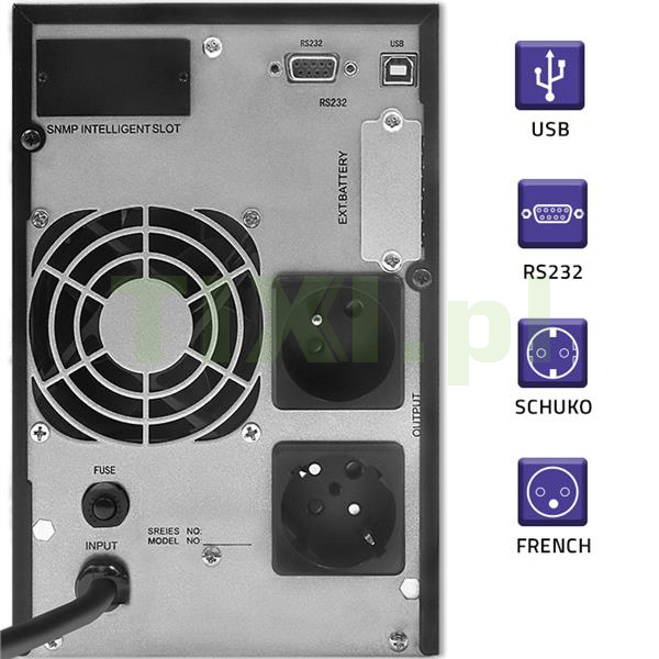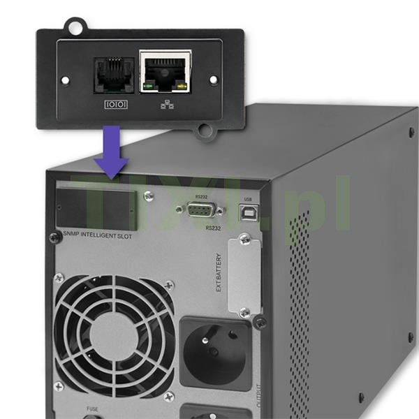 - możliwość montażu karty SNMP lub podłączenia adaptera SNMP – to standard zarządzania siecią, dzięki któremu w szybki i prosty sposób zbierzesz informacje o podłączony urządzeniach, czy też skonfigurujesz ich parametry, (kompatybilny moduł SNMP: kod produktu