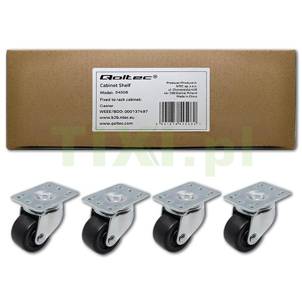 Oferowany przez nas funkcjonalny zestaw 4 obrotowych kół o łącznym obciążeniu 100kg, wykonany z wytrzymałych stopów metali oraz tworzywa sztucznego, pozwoli na szybkie i bezpieczne przemieszczanie szafy rack, zapewniając jej stabilną pozycję. Mocowanie kółek transportowych poprzez proste przykręcenie do otworów znajdujących się w stalowej konstrukcji.