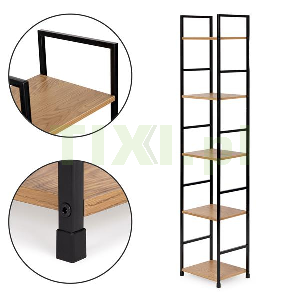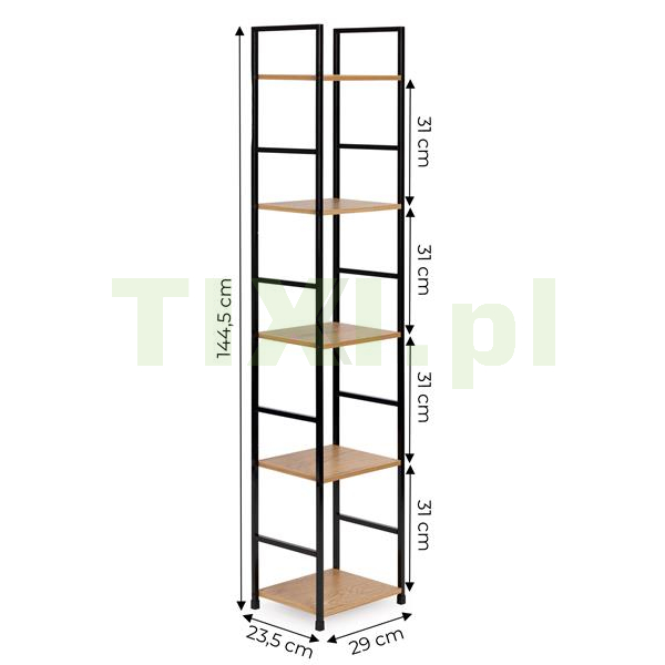 Półki zostały wykonane z płyty MDF, którą pokryto okleiną imitującą drewno. Ich wymiary 23,5x29 cm, pozwolą pomieścić wszystko to, co lubisz mieć pod ręką. Odległość między półkami to 31 cm.