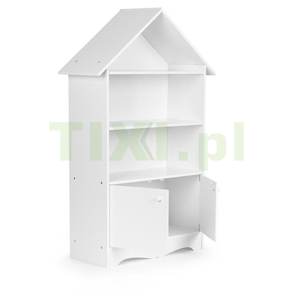 Regał w kształcie domku to mebel, który sprawdzi się w każdym dziecięcym pokoju, dzięki niemu zapanuje tam porządek. Półki i zamykana szafka pomieszczą ulubione książki, zabawki i wszystko to, co Twoja pociecha lubi mieć pod ręką. Jego biały kolor sprawia, że regał idealnie wpasuje się w każdy rodzaj wnętrza.