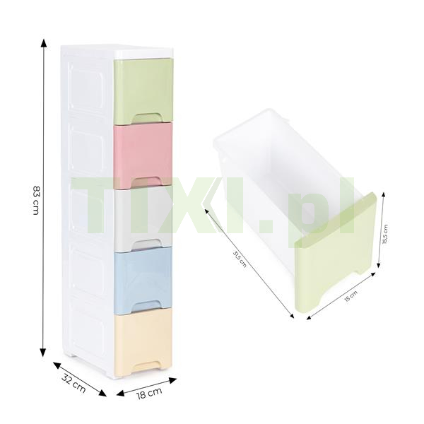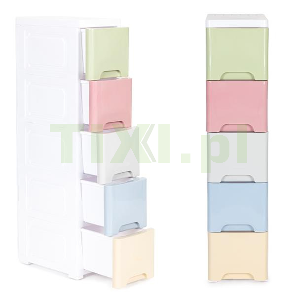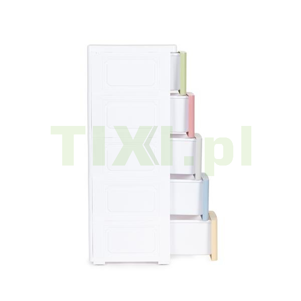 Regał składa się z pięciu kolorowych szuflad ze specjalnie wyprofilowanym uchwytem na froncie, co ułatwi Ci ich wsuwanie i wysuwanie.