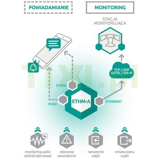 ETHM-A to uniwersalny moduł monitorujący, który może pracować autonomicznie, w ramach systemu sygnalizacji włamania i napadu lub w systemach automatyki. Moduł umożliwia przesyłanie informacji po sieci Ethernet.