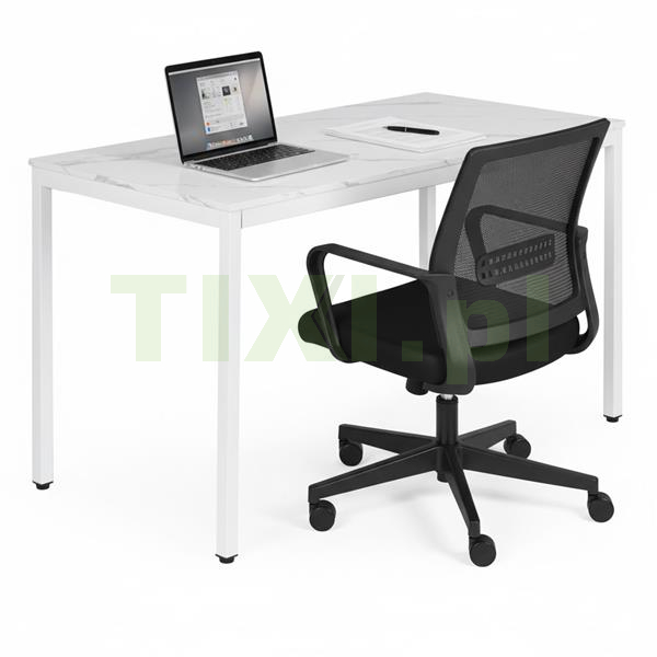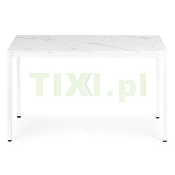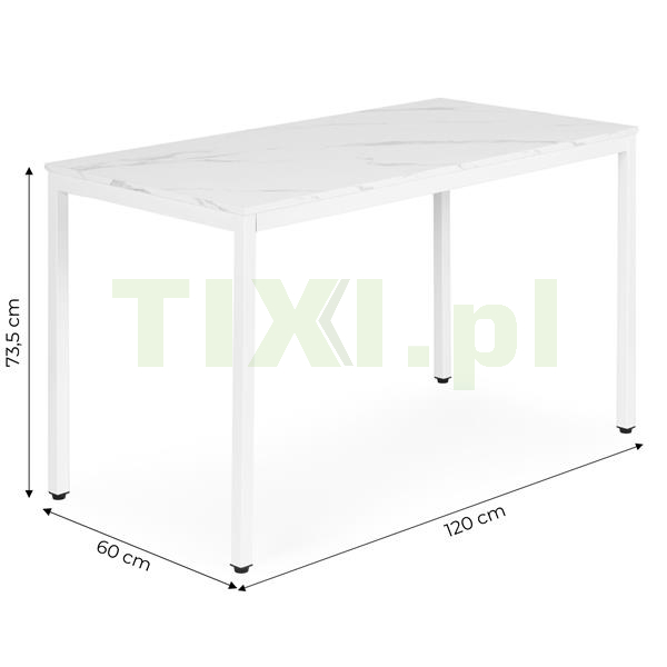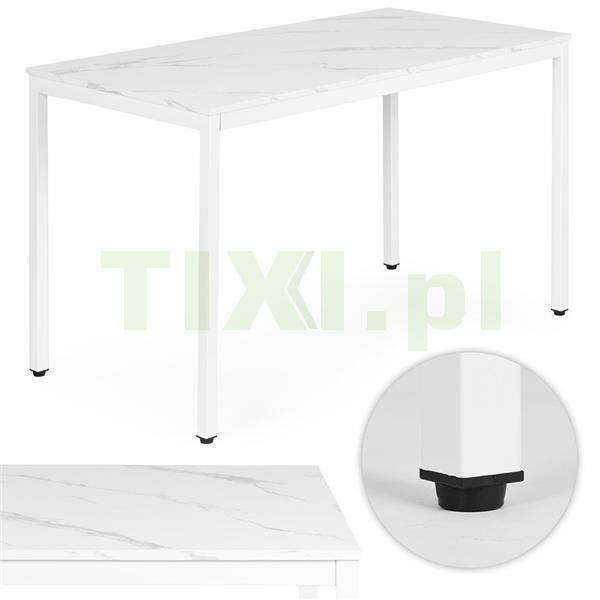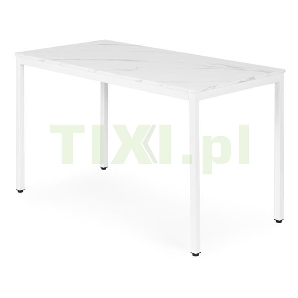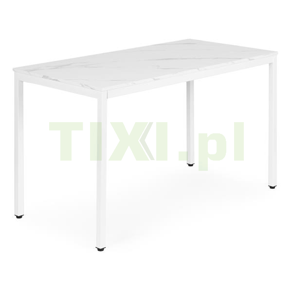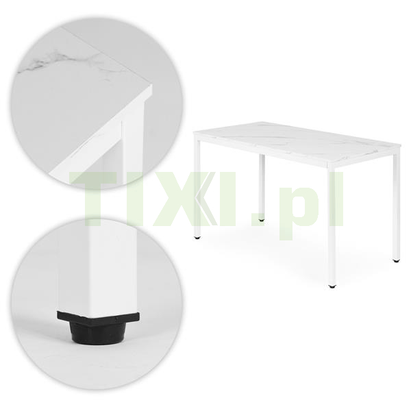Blat wykonano z wytrzymałej płyty MDF pokrytej melaminą, imitującej biały marmur – materiał ten jest odporny na zarysowania i łatwy do utrzymania w czystości. Konstrukcję wspierają metalowe nogi malowane proszkowo, co zwiększa odporność na korozję oraz uszkodzenia mechaniczne.