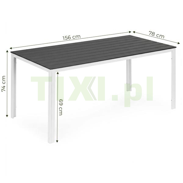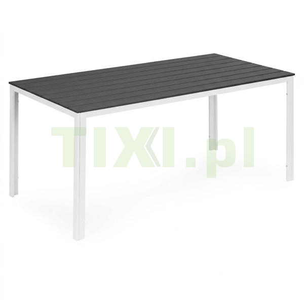 Blat wykonano ze specjalnego tworzywa polywood, które cechuje się odpornością na warunki atmosferyczne. Jego forma oraz faktura imitują naturalne drewno, nadając całości elegancki, ponadczasowy charakter. Niewielkie odstępy między deskami umożliwiają swobodne odprowadzanie wody podczas opadów, co zwiększa funkcjonalność stołu i ułatwia jego codzienne użytkowanie na zewnątrz.