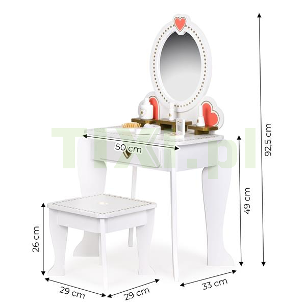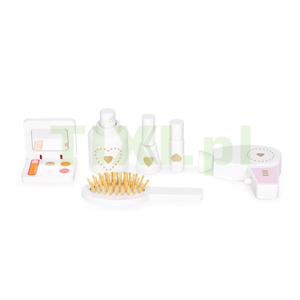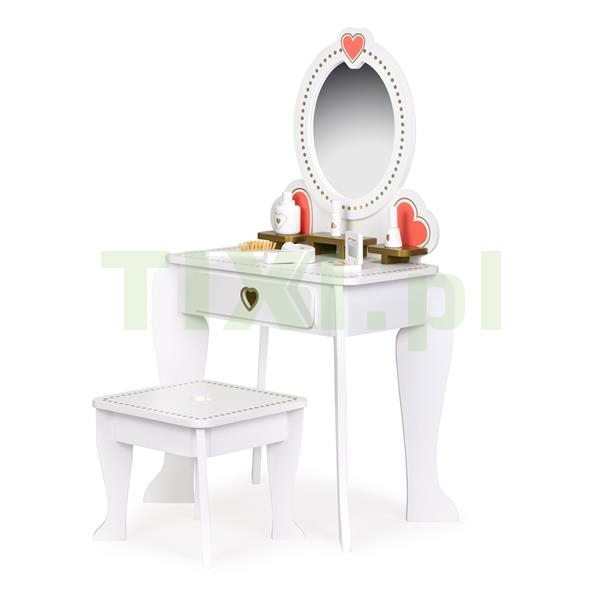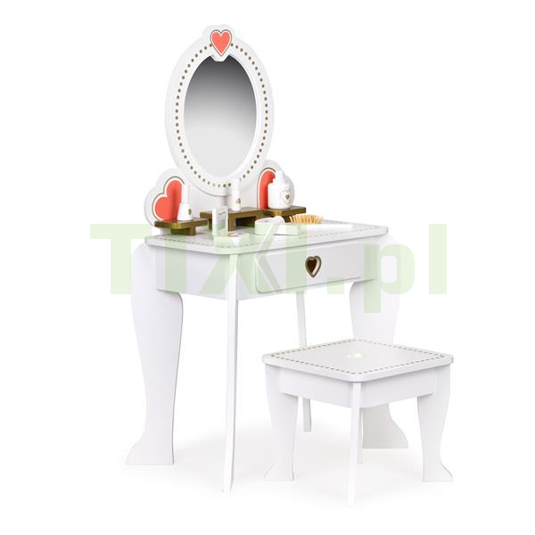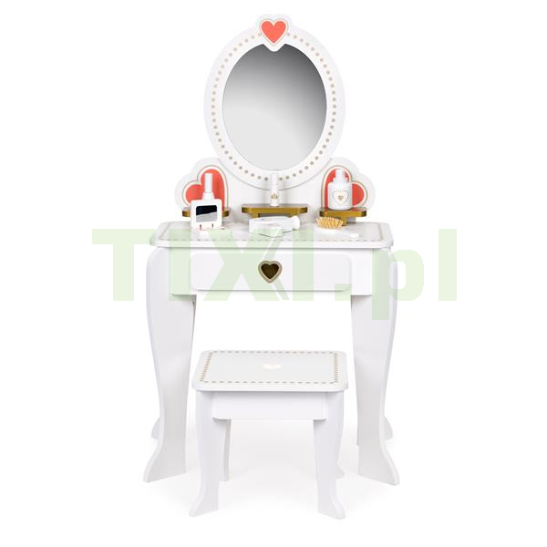 Toaletka wyposażona jest w dodatki, takie jak zabawkowa suszarka, drewniana szczotka czy też małe lustereczko do makijażu. Wszystkie akcesoria pozbawione są ostrych krawędzi, dzięki czemu są w pełni bezpieczne dla dzieci.