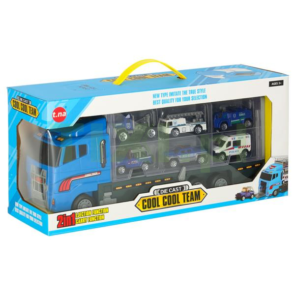 Transporter otwiera się z dwóch stron, z każdej zmieści się 6 aut. Duże przezroczyste drzwi zamkniesz małą blokadą. Dzięki temu maszyny nie wypadną z ciężarówki w trakcie jazdy.