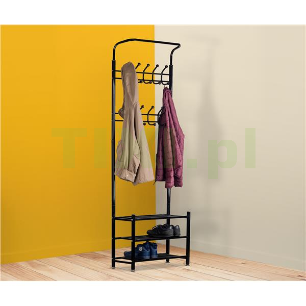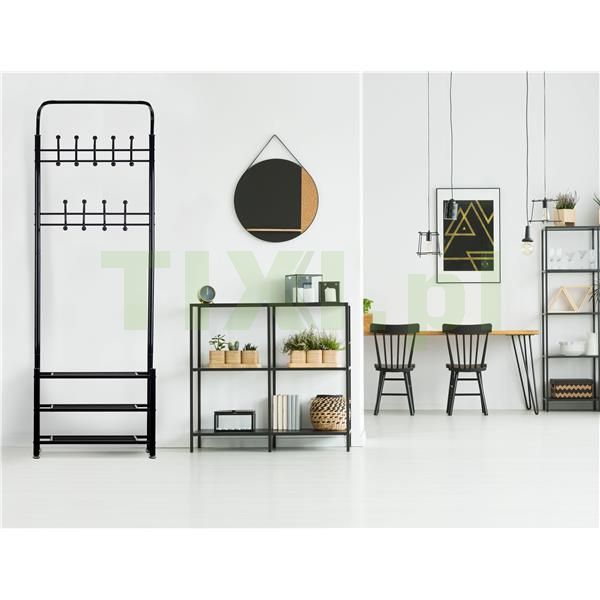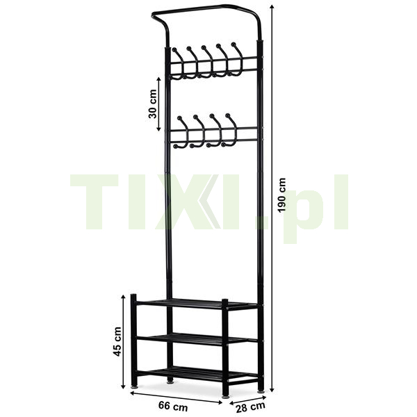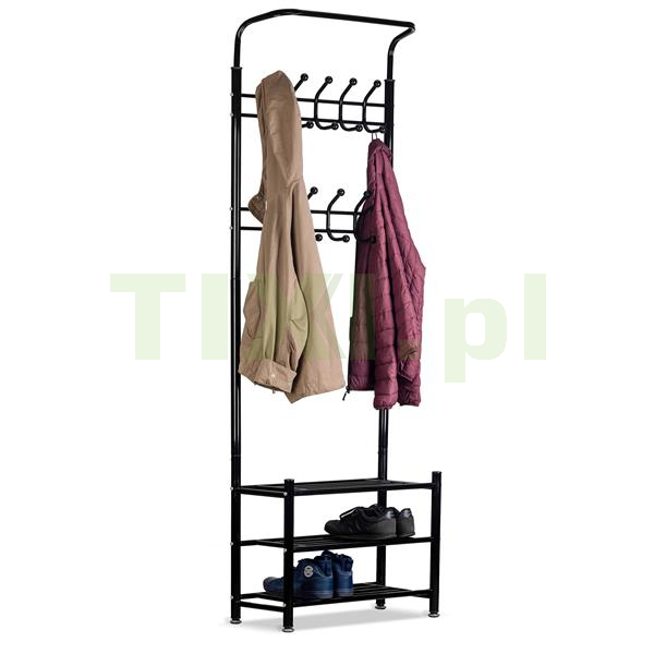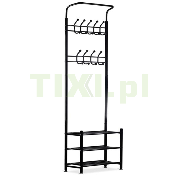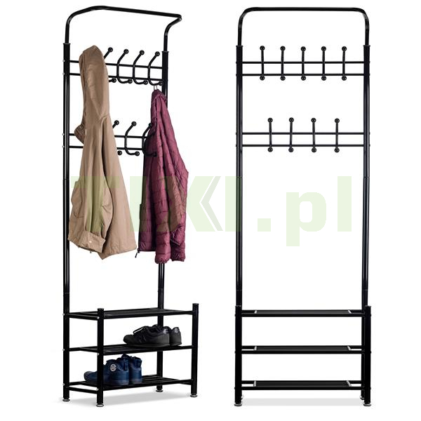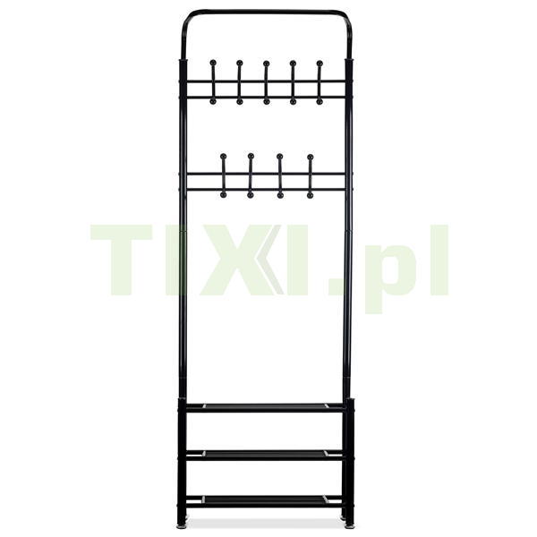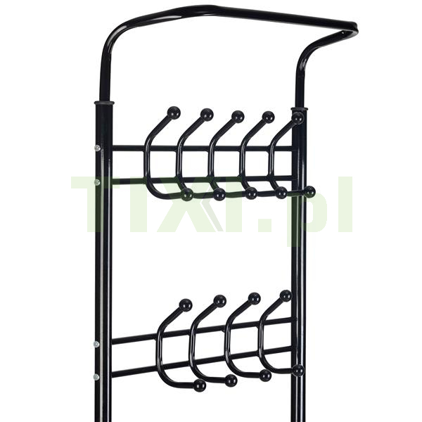 W górnej części znajdują się dwa rzędy z 18 wieszakami, dzięki dużej ilości haków idealnie sprawdzi się w domowych garderobach, biurach czy poczekalniach.