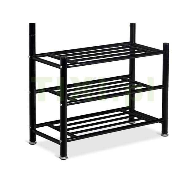 Stojak w dolnej części posiada trzy funkcjonalne półki, na których można odłożyć mniejsze elementy garderoby, torebki a nawet buty.