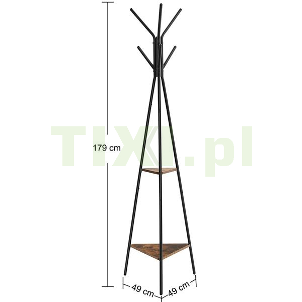 Ten niewiele zajmujący miejsca produkt posiada stabilną trójkątną podstawę, dzięki której mamy pewność, że produkt nie będzie się przechylał wraz z dodatkowym obciążeniem. Ponadto produkt został wyposażony w 6 zaokrąglonych haczyków do przechowywania płaszczy, kurtek, toreb czy też szali i czapek.