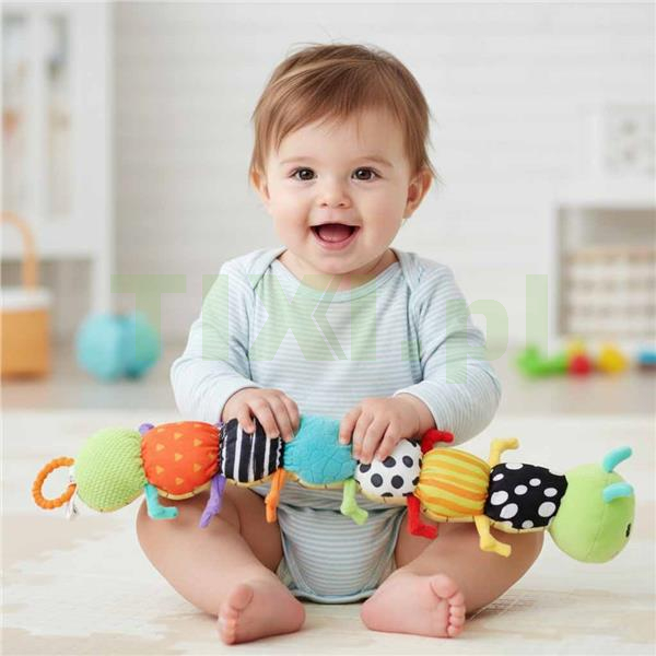 To nie jest zwykła maskotka. Pluszowa gąsienica sensoryczna wprowadza dziecko w świat dźwięków, faktur i reakcji. Interaktywna gąsienica staje się idealnym punktem startowym dla odkrywania, jak działa zasada przyczyny i skutku. To wielofunkcyjna pluszowa zabawka, w której grzechotka, piszczałka, miękki gryzak i szeleszczący papier tworzą spójną całość, a subtelny szelest przyciąga uwagę bez przebodźcowania.