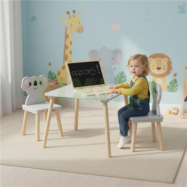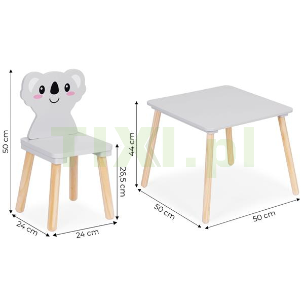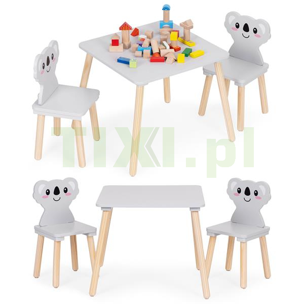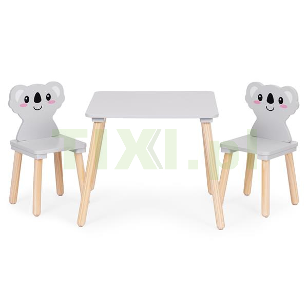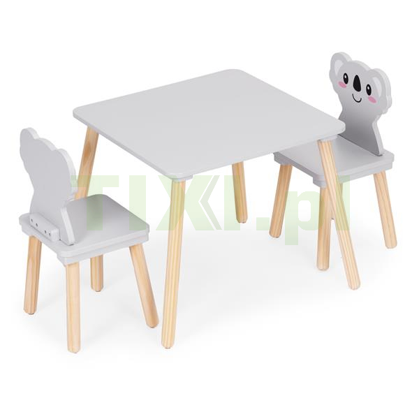 W skład zestawu wchodzą dwa wygodne krzesełka, zaprojektowane z myślą o komforcie i ergonomii dla najmłodszych. Ich wymiary zostały idealnie dostosowane do wysokości stolika, co umożliwia dziecku przyjęcie prawidłowej postawy podczas siedzenia oraz zapewnia pełną swobodę ruchów – zarówno podczas zabawy, jak i nauki. Oparcia w kształcie koali przyciągają uwagę i wprowadzają do wnętrza radosny, dziecięcy klimat.